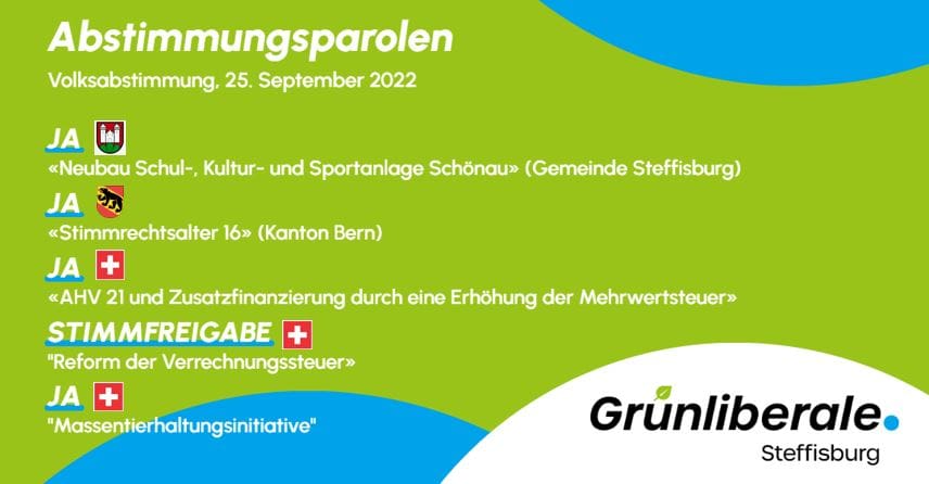National– Massentierhaltungsinitiative: 10 JA, 1 NEIN, 1 Stimmfreigabe– Zusatzfinanzierung der AHV durch eine Erhöhung der Mehrwertsteuer: einstimmig JA– Änderung des Bundesgesetzes über die Alters- und Hinterlassenenversicherung: einstimmig JA– Änderung des Bundesgesetzes über die Verrechnungssteuer: 1 JA, 2 NEIN, 7 Stimmfreigabe Kantonal– Änderung der Kantonsverfassung (Stimmrechtsalter 16): 9 JA, 2 NEIN Gemeinde Steffisburg– Verpflichtungskredit für Neubau […]